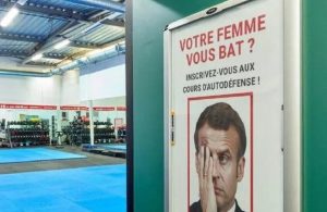 ووفقا لمنشورات على وسائل التواصل الاجتماعي، جاء في الإعلان المنشور في صورة يبدو أنها التُقطت في أحد صالات الألعاب الرياضية الفرنسية: “زوجتك تضربك؟ سجل في دورات الدفاع عن النفس! لمزيد من المعلومات، اتصل بالإدارة”. ويظهر على الملصق الإعلاني صورة لماكرون بعين مغطاة وعلامة كدمة على جبينه.